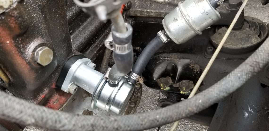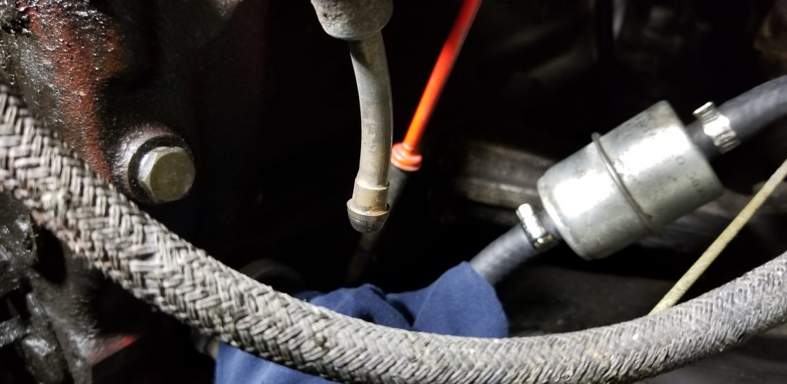 Additionally the new pump doesn’t use a threaded fitting for the pressure line as seen below. A few options are available here. The entire line can be replaced which means significantly altering the look of the engine and requires finding the appropriate hardware to mate back up to the Zeniths. This option was deemed as too much trouble and sacrifice for us. Another option would be to cut the line at the end nearest the pump. Not a bad option but we wanted a flared end for safety. Likely the line could have been flared easily enough however we thought we could skip a step, and we were right. We cut the OEM captured threaded fitting off of the line itself, leaving behind the factory flare.