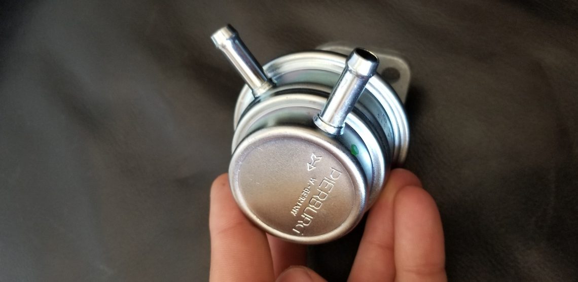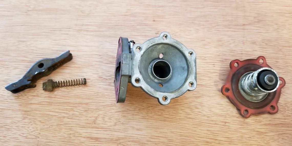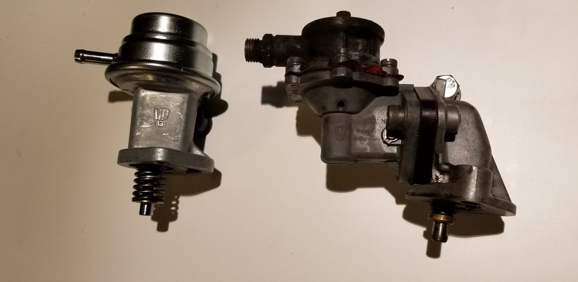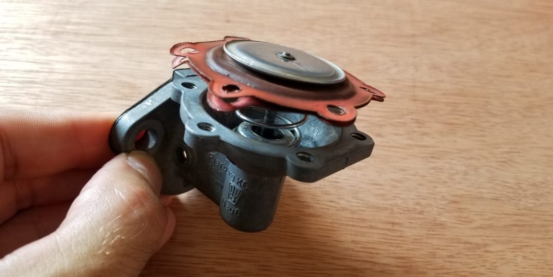 Okay so the problem had been found, now came the time to find the replacement diaphragm. Unfortunately unlike many fuel pump diaphragms our unit doesn’t disassemble any further than pictured, so the spring, seal, rod, and diaphragm must be replaced as an entire unit. Not only is it not offered by Mercedes Classics, it doesn’t even appear on the exploded Mercedes fuel pump diagram.