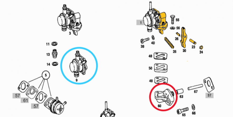 Visually the replacement pump design is different enough that it was only with the full assurance of Mercedes Classics that we ordered it. The new pump does away with the intermediate mount as seen in the exploded diagram above circled in red and numbered ’60’. The new pump bolts directly to the engine block thus the plunger of the diaphragm is activated directly without the rocker mechanism seen highlighted in yellow and numbered ’20’. The following photo shows the significant differences.