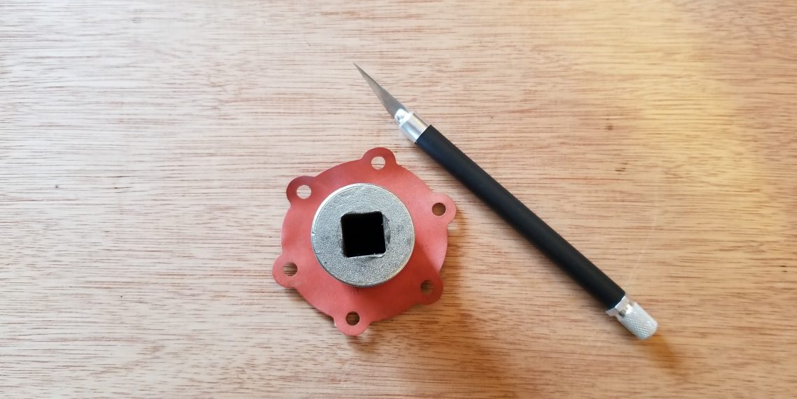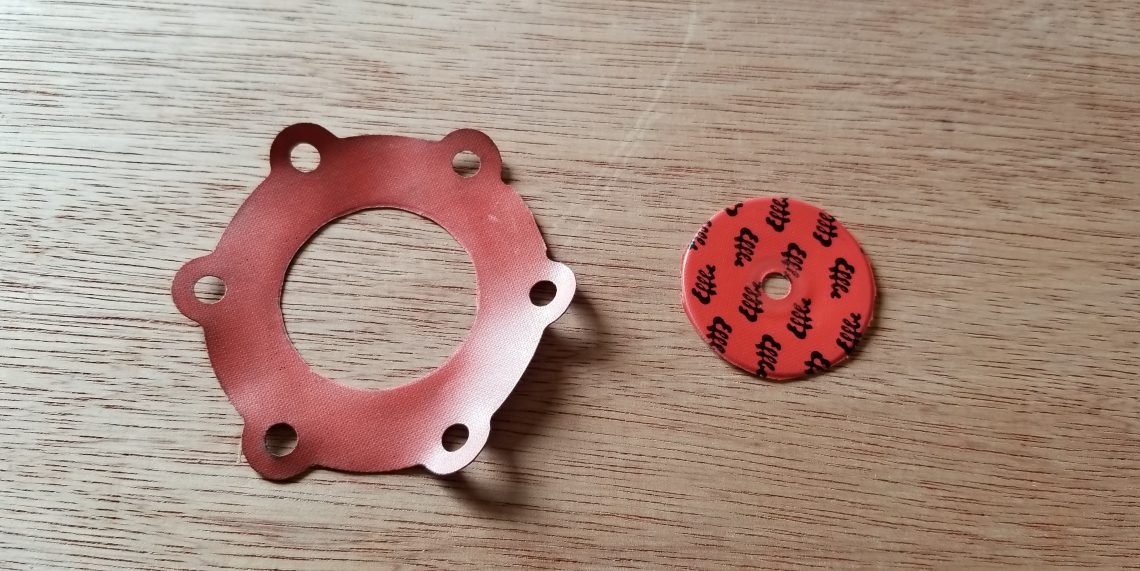 By now the secondary plan of attack is probably becoming clear. While the new layer of diaphragm fit well, it alone wouldn’t be capable of preventing fuel from travelling to the other side of the pump because it isn’t sealed along the inner diameter. The next step then was to try gluing the old diaphragm to the new diaphragm. While the diaphragms looked like butyl rubber and smelled like it too, were they? An experiment with a couple of scraps, seemed to confirm it.